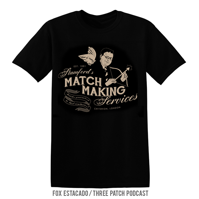 “Stamford's Matchmaking Services” shirt commemorates Mike Stamford’s very important contribution to the Sherlock Holmes fandom -- introducing John Watson to Sherlock Holmes.