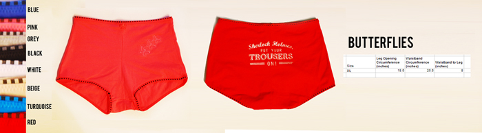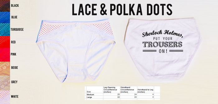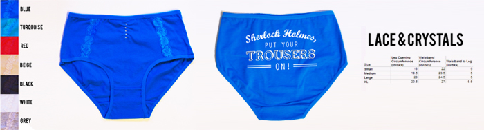 "Sherlock Holmes, Put Your Trousers On" undies are handprinted on three adorable styles of cotton undies: lace & crystals, lace & polka dots, and butterflies. The quote is cheekily printed on the backside.